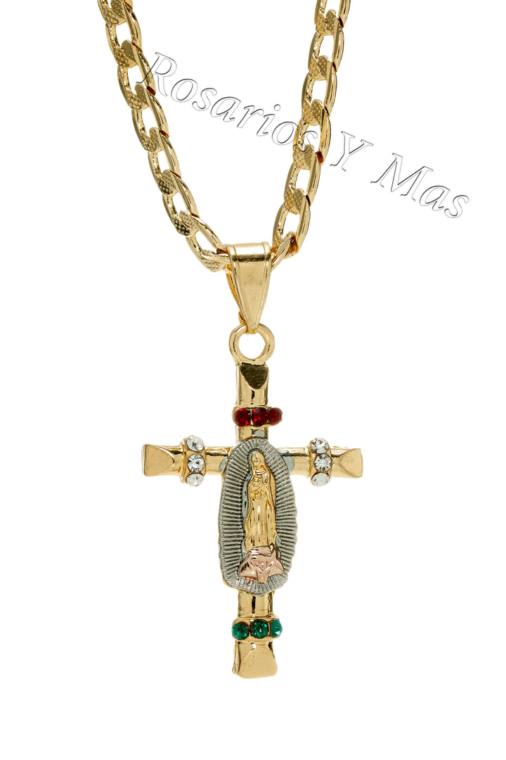 Medalla con la imagen de La Virgen De Guadalupe en Cruz de tres tonos con piedras color Verde, Blanco y Rojo