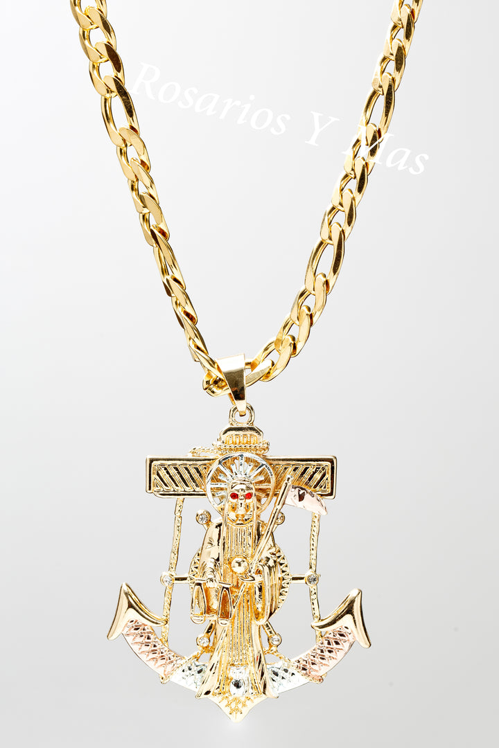 24K Gold Filled Santa Muerte Anchor Pendant with 26" Necklace Three Gold Tone
