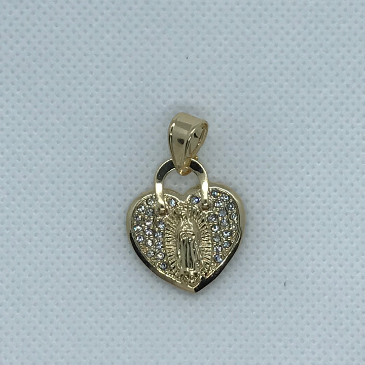 24K Gold Filled Our Lady of Guadalupe in a Heart with White Rhinestones - Pendant Only