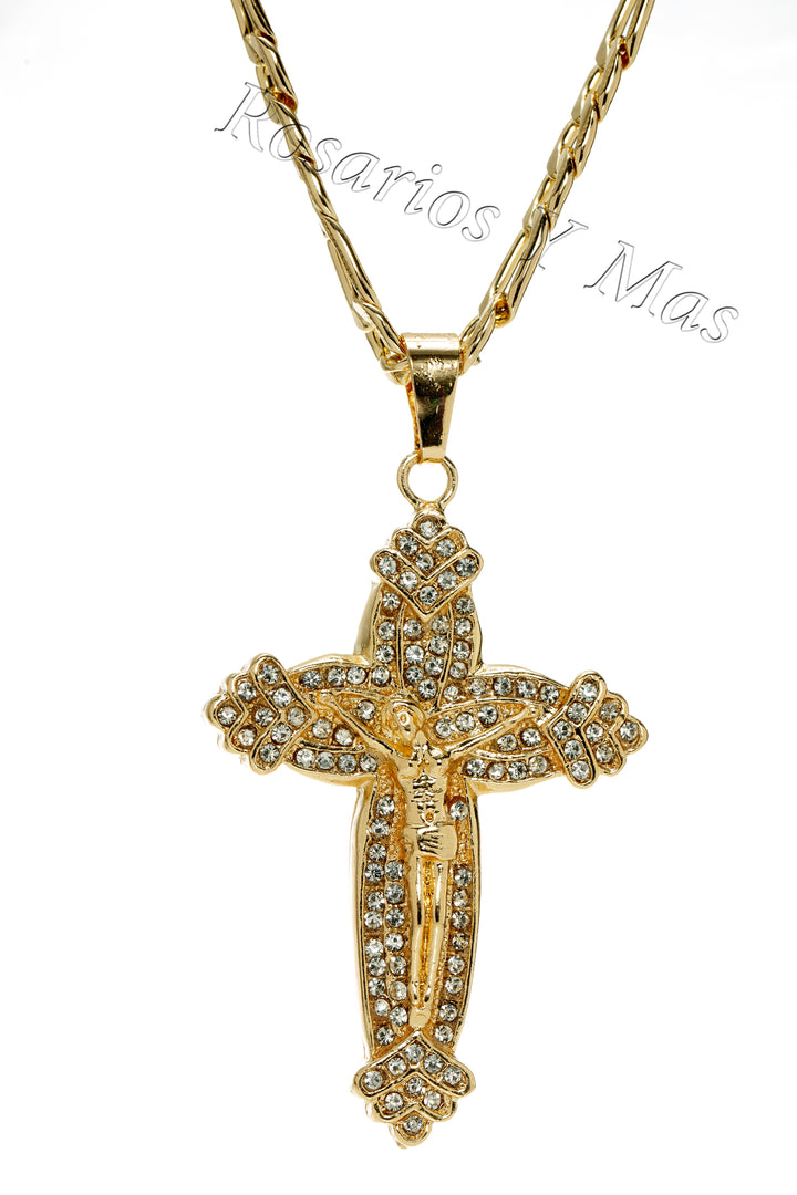 Cruz Brillante con cadena de 26" Cruz con piedras Blancas Incluye cadena de 26" de Oro Laminado sobro Acero Es de 24K Oro Laminado Cruz Mide 1 1/2" por 2 3/4" Cadena Mide...