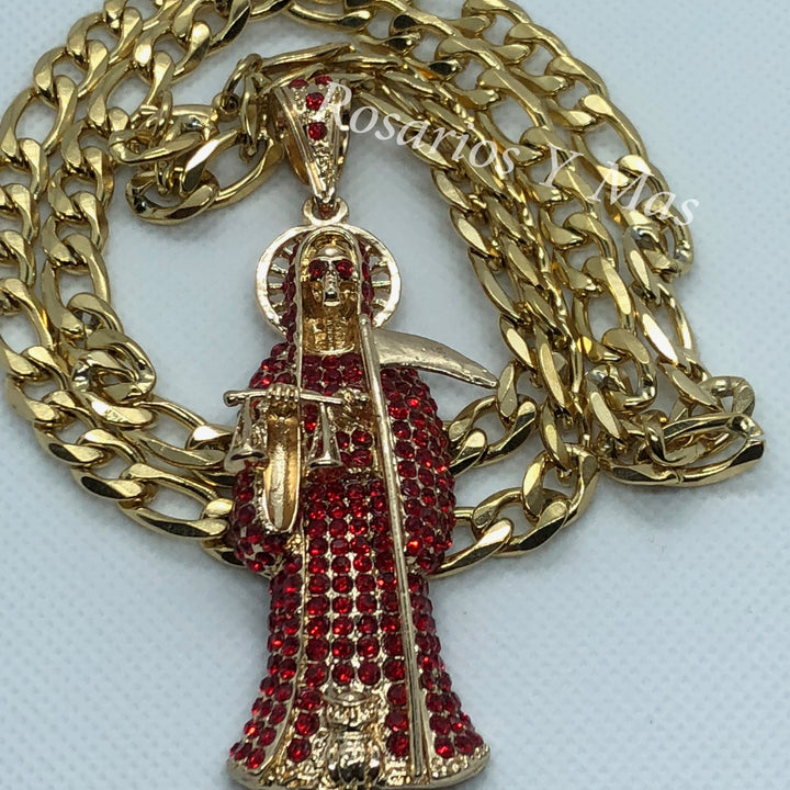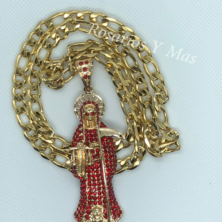 Medalla de Santa Muerte con cadena de 26" Medalla con la imagen de Santa Muerte con piedras color Rojo La Santa Muerte vestida de Color Rojo es para resolver problemas con el amor...