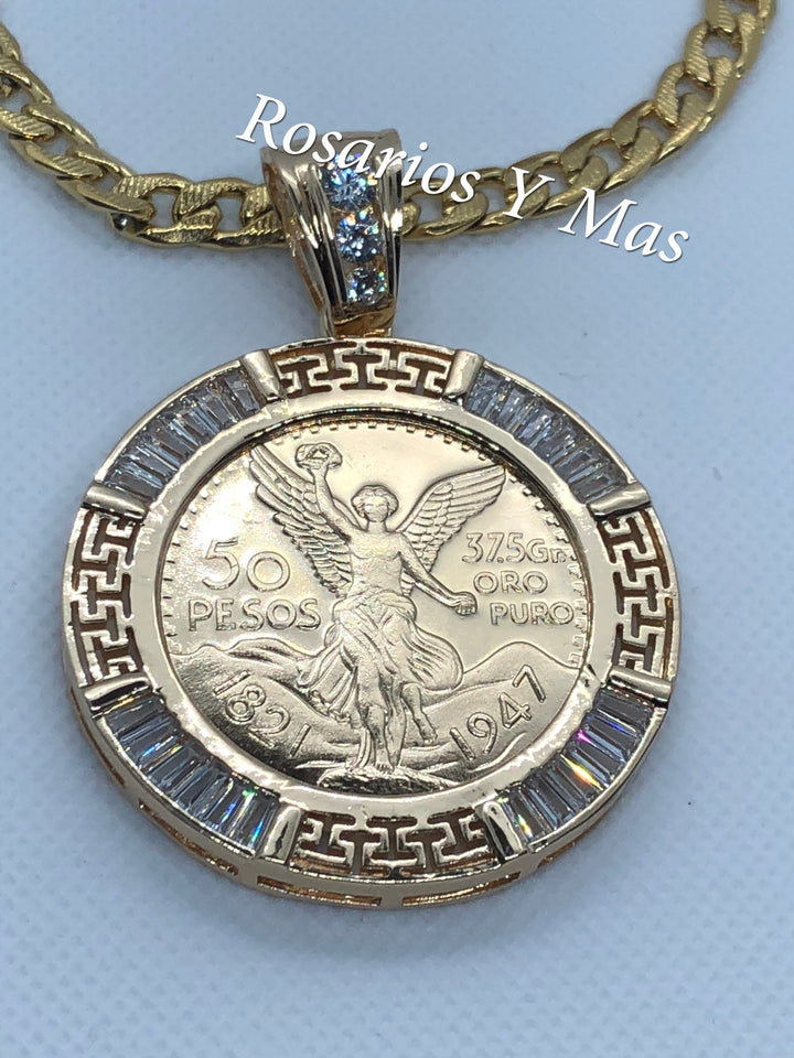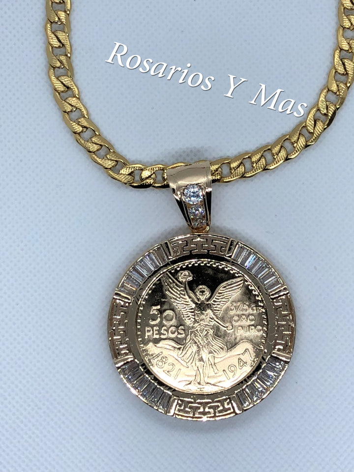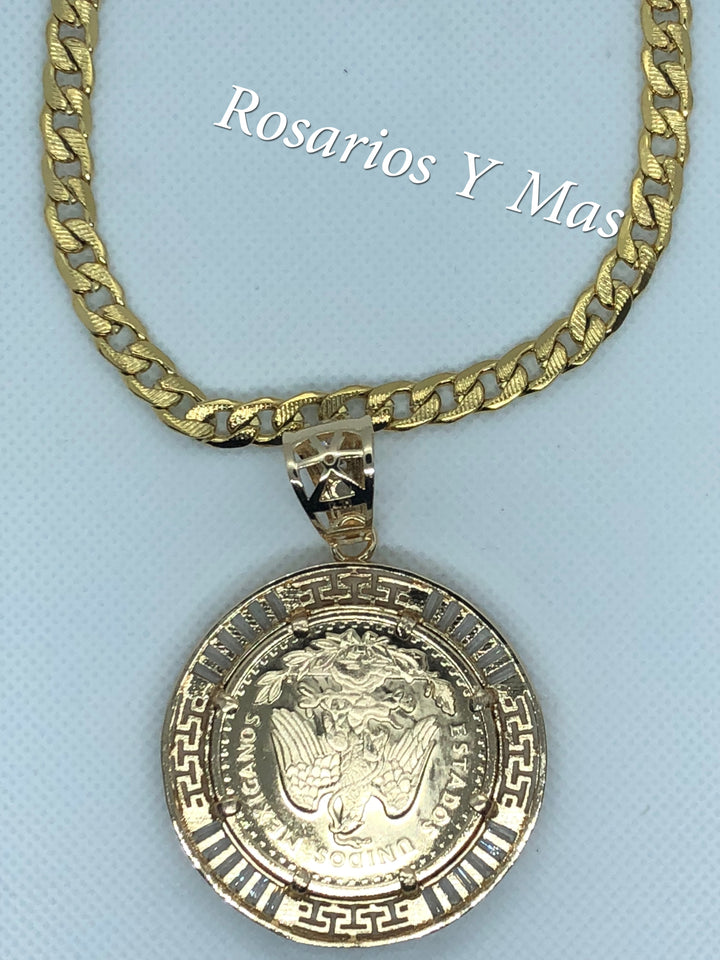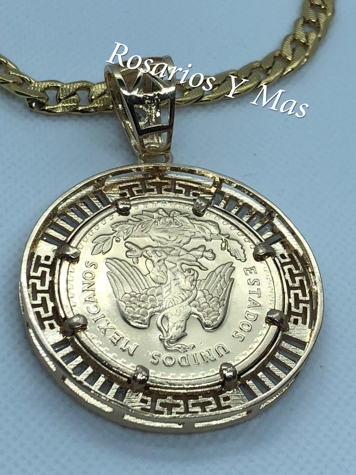 Medalla de 50 Pesos y Aguila Mexicana con cadena de 26" Doble Cara - 50 Pesos en Frente y Aguila Mexicana en el otro lado Incluye cadena de 26" de Oro Laminado sobro Acero Es...