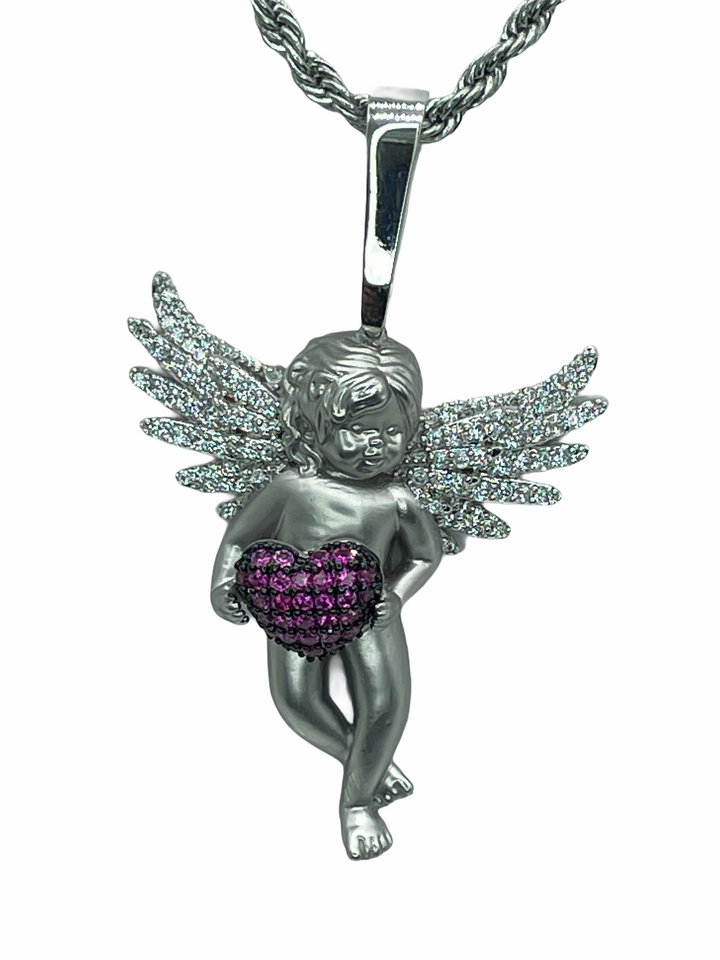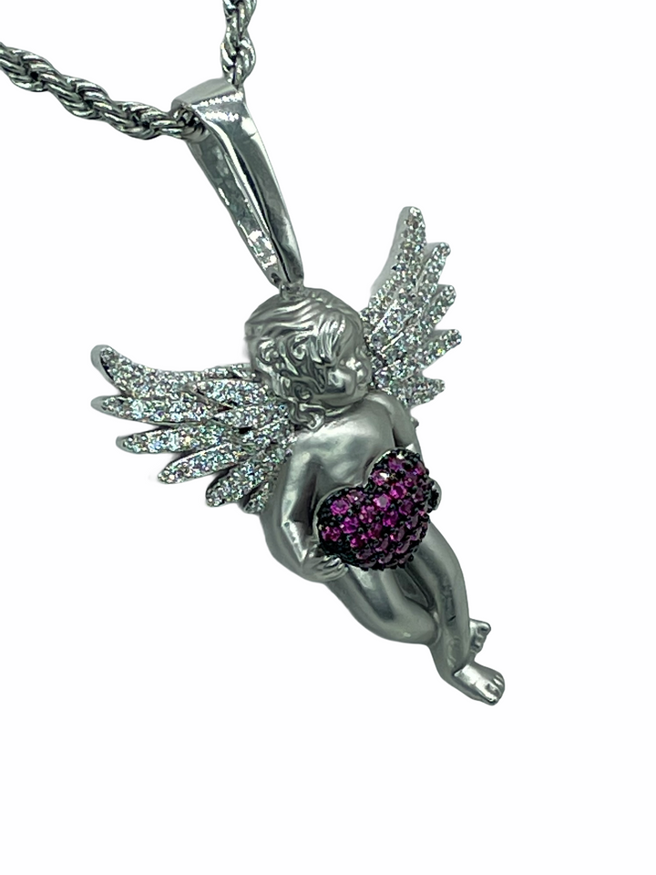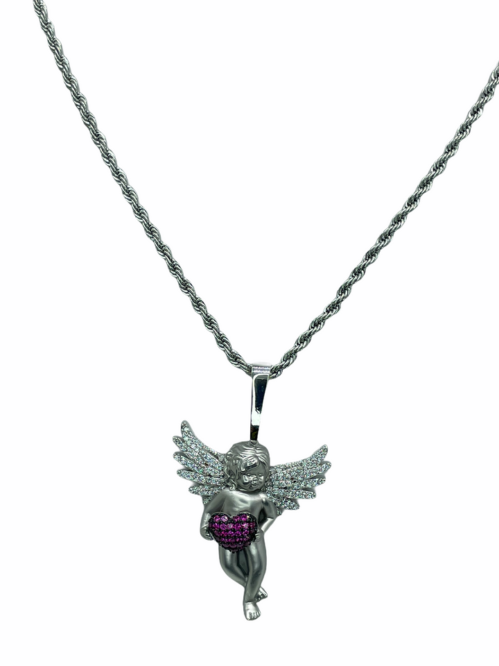 Angel with Heart Angel with Heart Pendant Micro Pave Stones Rope Style Necklace 14K White Gold Finish Pendant Measures - 2" Necklace Measures - 24"