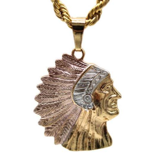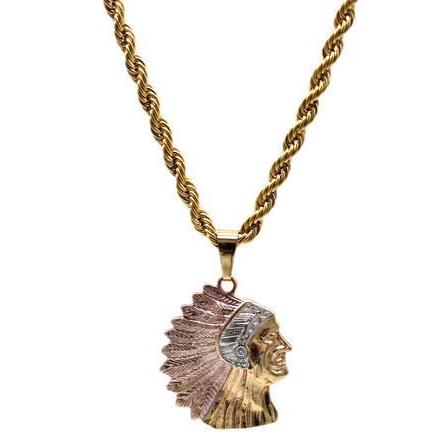 Apache/Indian with Necklace Apache/Indian Pendant - Three Tone Includes a 26" Rope Necklace that is Gold Filled over Stainless Steel 24K Gold Filled Pendant Measures 2" Necklace Measures 26" and its 5 mm...