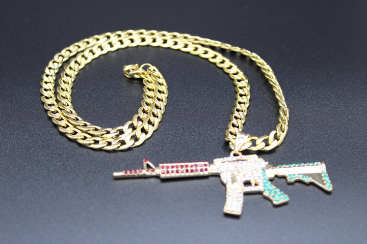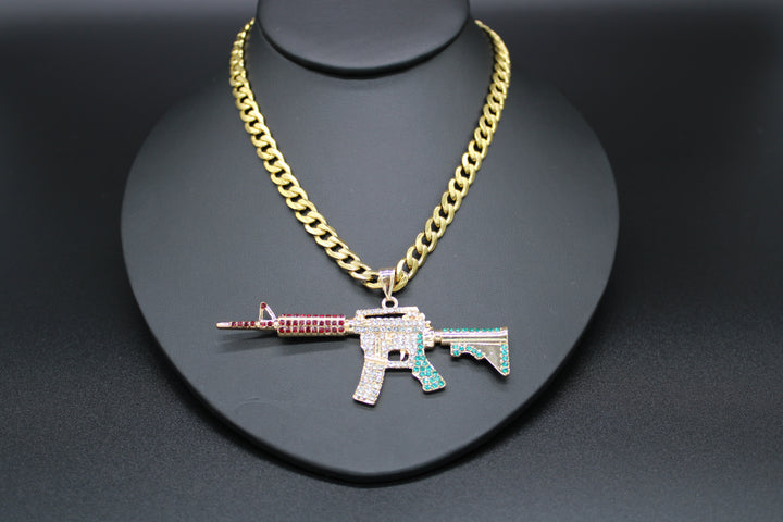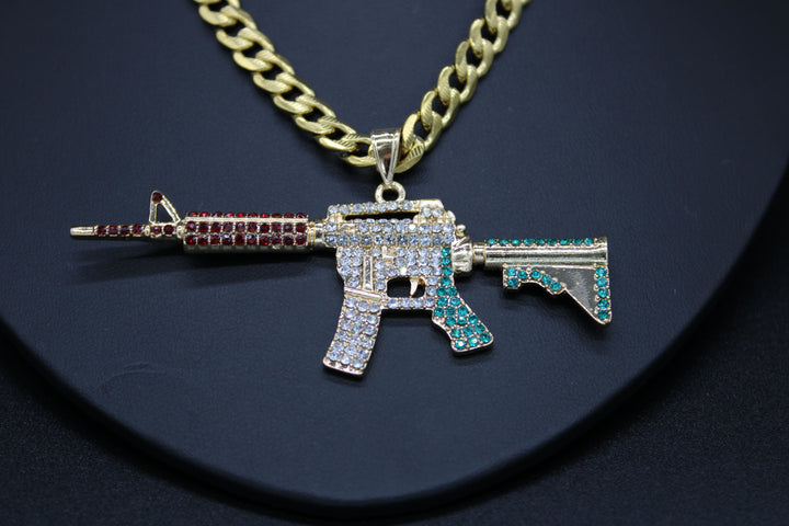 Assault Riffle w/ Mexican Color Rhinestones with 26"Necklace (24K Gold Plated)