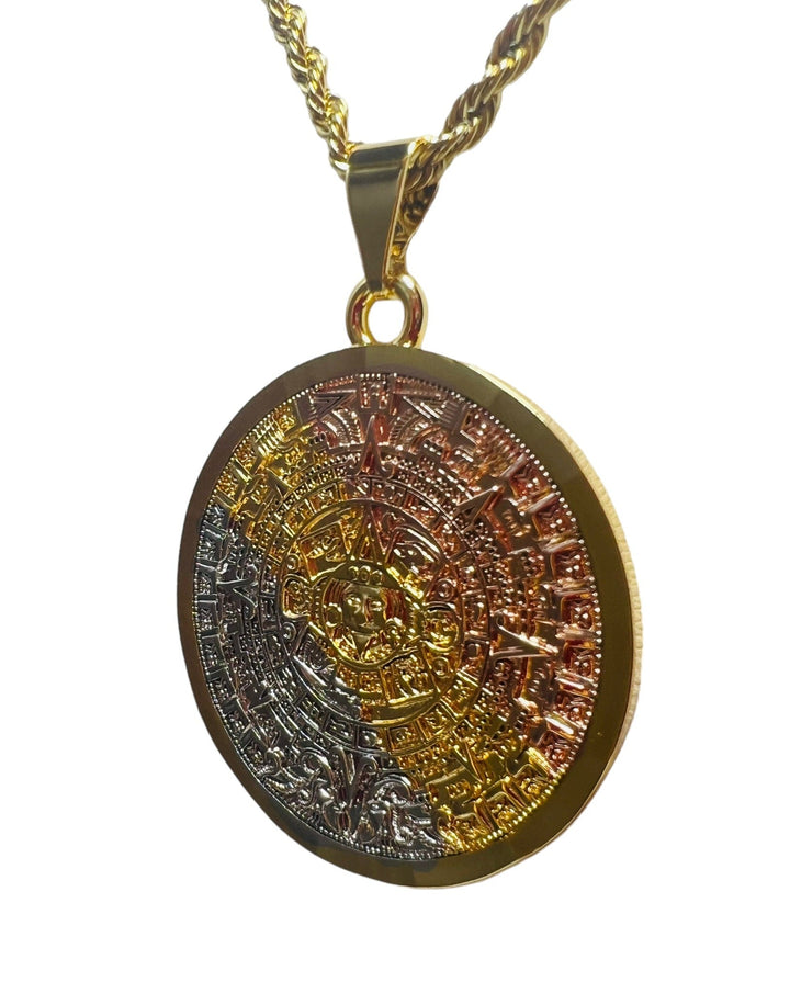 Aztec Calendar with Necklace Aztec Calendar Pendant Three Tone Includes a 24" Rope Necklace that is Gold Filled over Stainless Steel 24K Gold Filled Pendant Measures 2 1/2" Necklace Measures 24" Calendario Azteca...