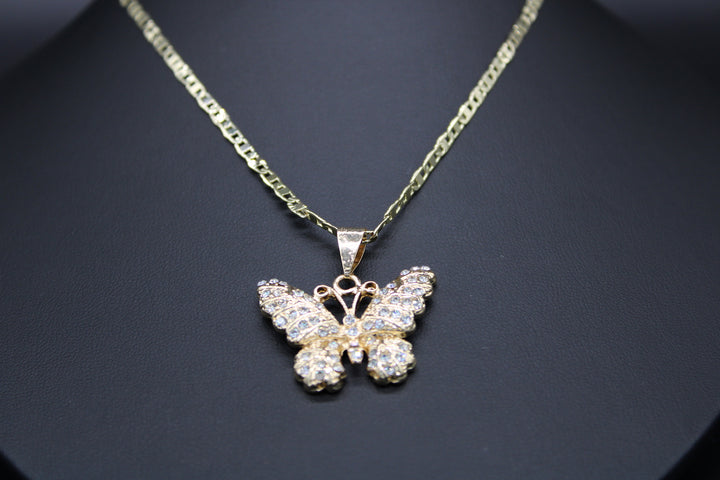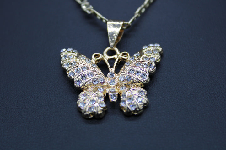 Butterfly Pendant with 22" Necklace Butterfly Pendant with White Cubic Zirconia Includes a 22" Gold Plated Necklace over Stainless Steel 24K Gold Plated Pendant Measures 1 1/4" Necklace Measures 22" Medalla de Mariposa de...