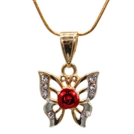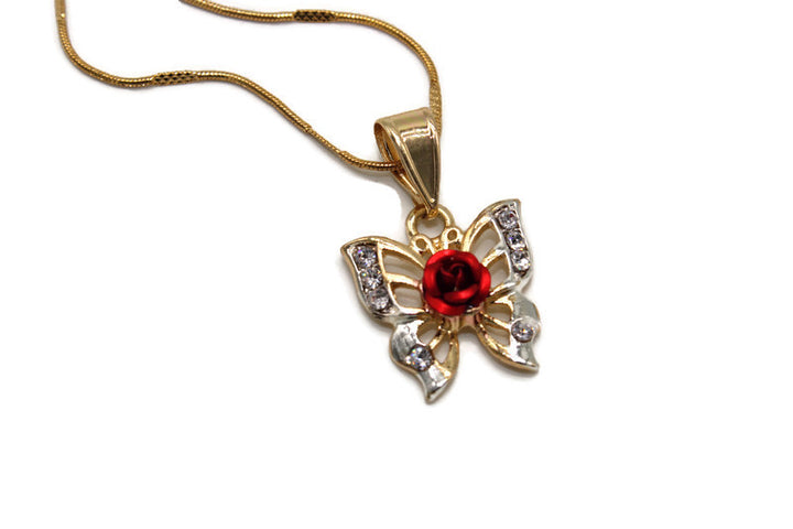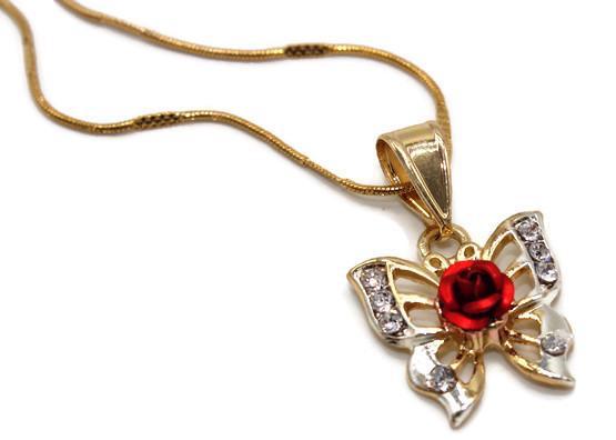 Butterfly with Rose with Necklace Butterfly with Red Rose Pendant Includes a 24" Necklace that is Gold Filled over Stainless Steel 24K Gold Filled Pendant Measures 1 1/4" Necklace Measures 22" Mariposa con...