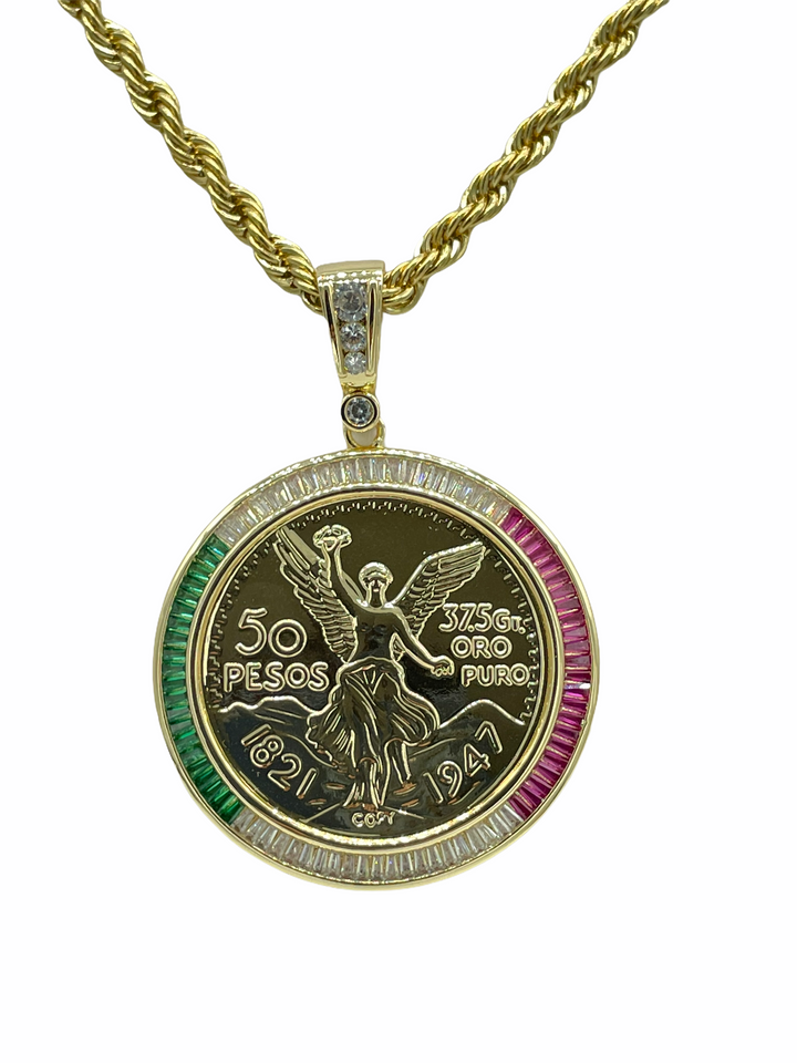 Centenario Centenario Coin Pendant Bezel has Mexican Flag Colors Pendant is 24K Gold Finish Chain is 24K Gold Filled Pendant Measures 2 3/4" Tall Necklace Measure 26" Centenario Medalla de Centenario La...