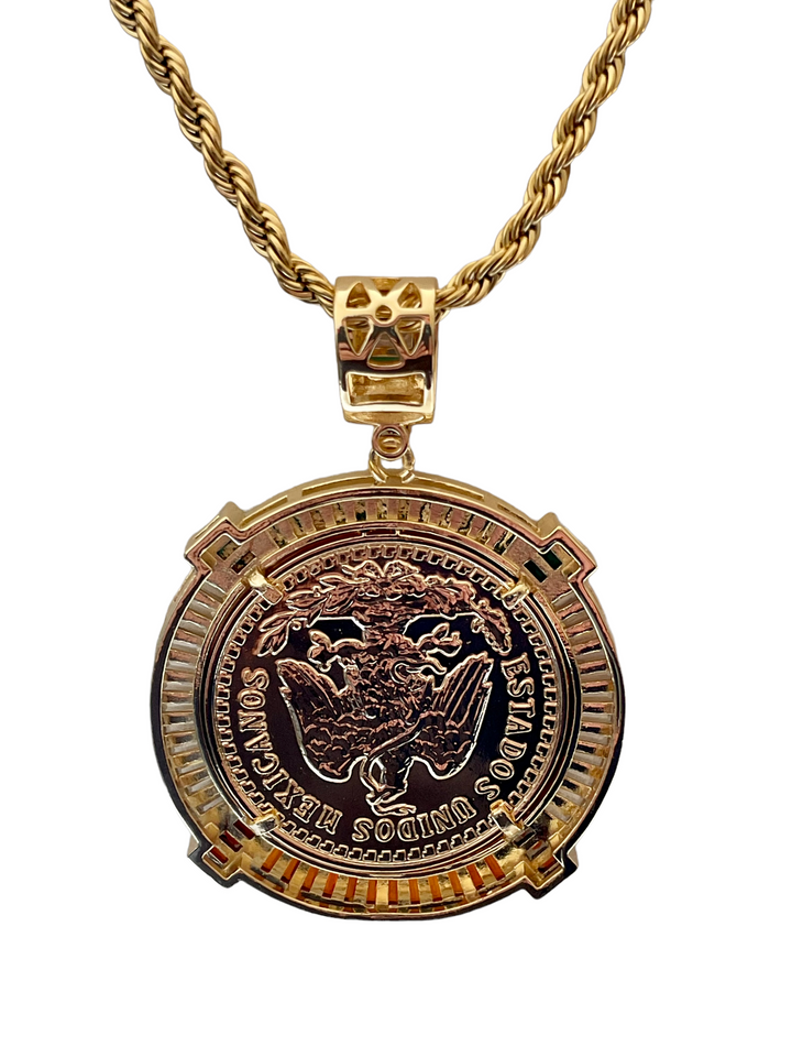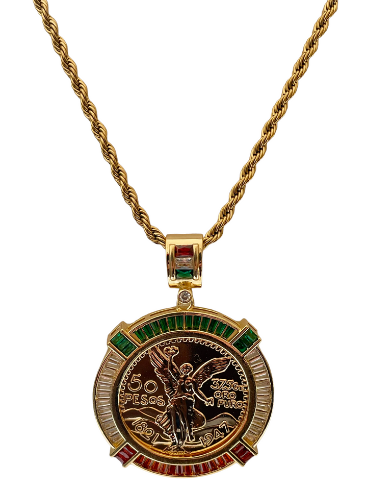 Centenario (50 Pesos and Mexican Eagle) Double Face - 50 Pesos on front side and Mexican Eagle on the other side The pendant has the Mexican colors in the front (Green, White,...