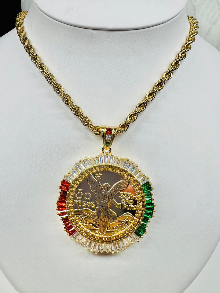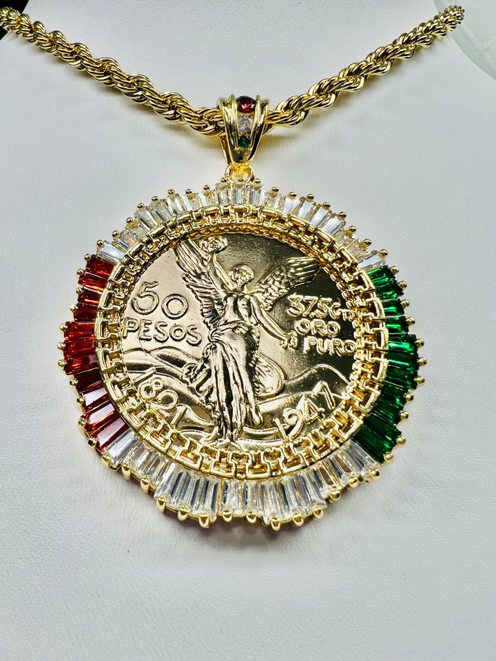 Centenario (50 Pesos and Mexican Eagle) Double Face - 50 Pesos on front side and Mexican Eagle on the other side The pendant has the mexican colors in the front (Green, White,...