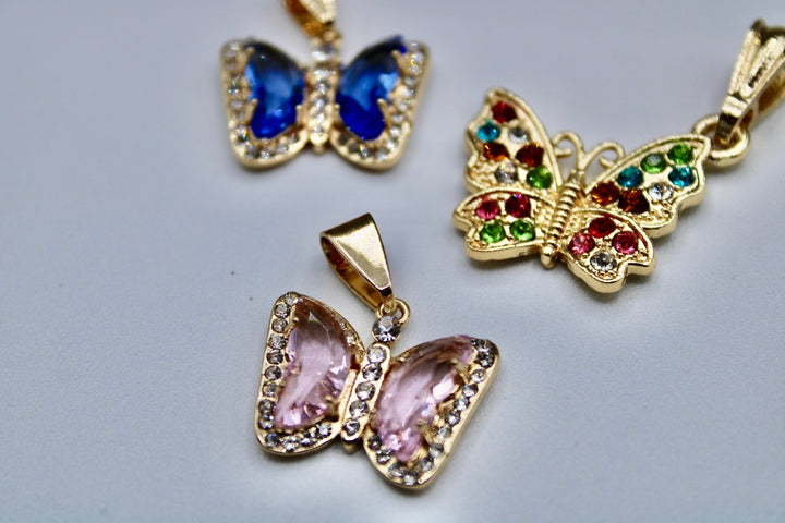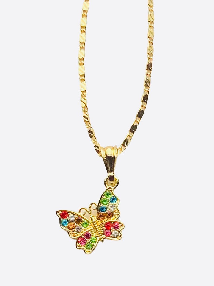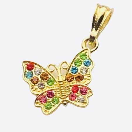 Butterfly with Colored Rhinestones Necklace Butterfly Pendant with Colored Rhinestones Includes a 22" Gold Filled over Stainless Steel Necklace 24K Gold Filled Pendant Measures 1/2" Necklace Measures 22" Cadena de Mariposa con...