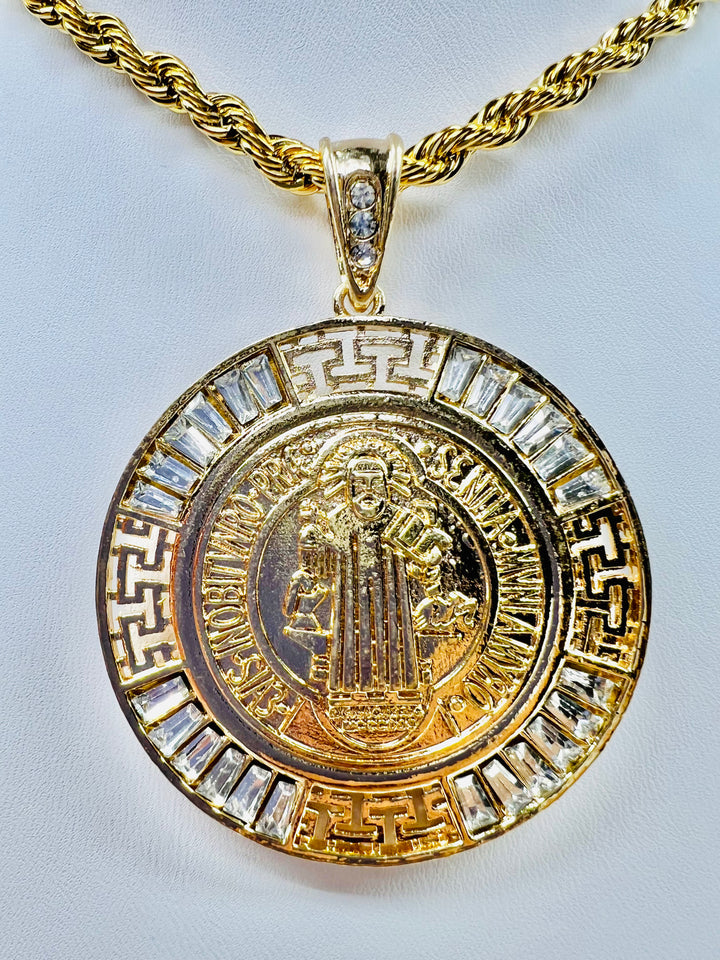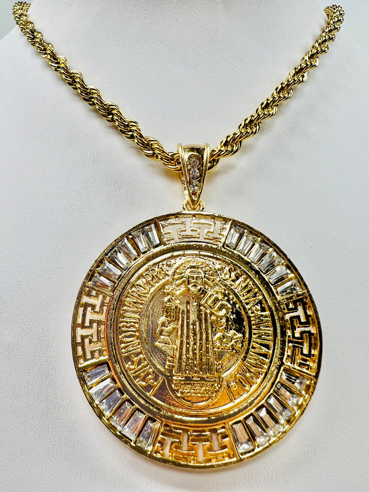 St Benedict Centenario Large St Benedict Round Centenario Pendant The pendant has the white color CZ stones Includes a 26" Rope Gold Filled over Stainless Steel Necklace 24K Gold Filled Pendant Measures...