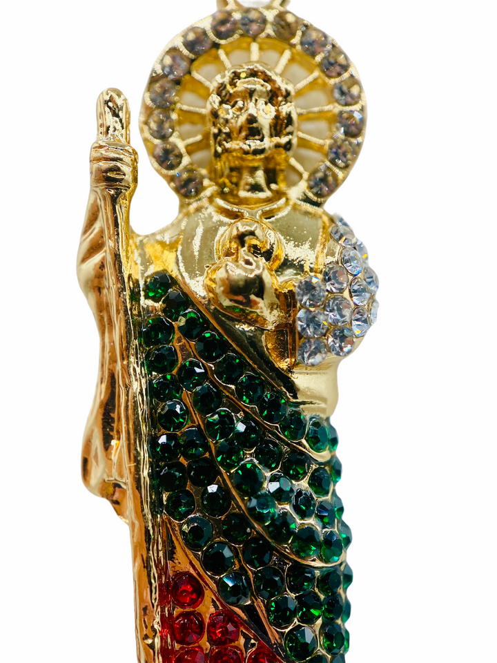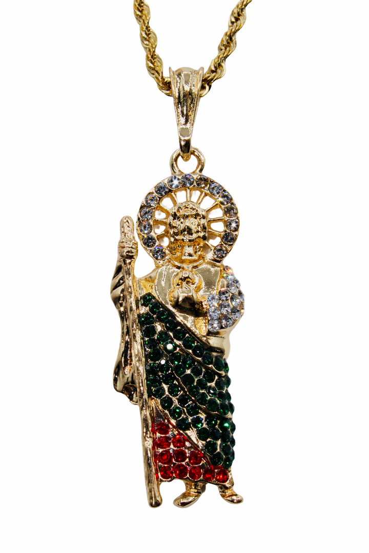 San Judas Pendant & Necklace San Judas with White, Green, & Red Rhinestones Includes a 20" Gold Filled over Stainless Steel Necklace 24K Gold Filled Pendant Measures 2" Necklace Measures 20"...