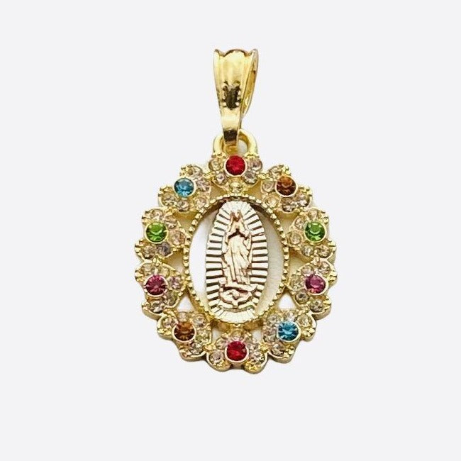 Our Lady of Guadalupe with Colored Rhinestones Our Lady of Guadalupe with colored Rhinestones Includes a 22" Gold Filled over Stainless Steel Necklace 24K Gold Filled Pendant Measures 1 1/4" Necklace...