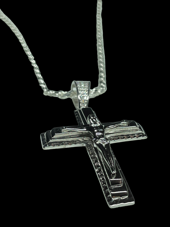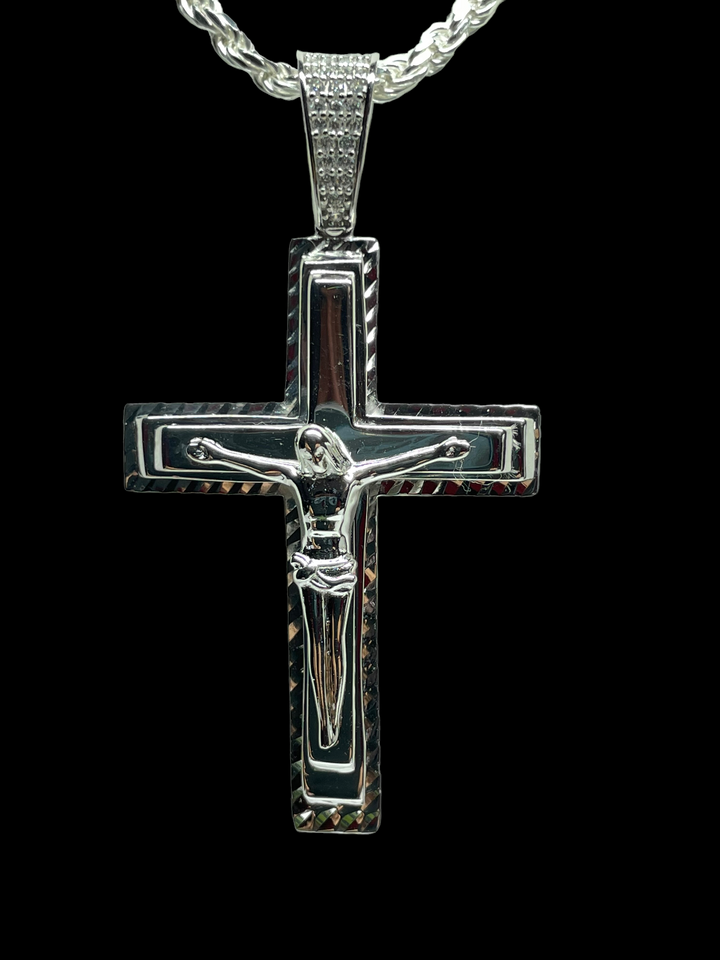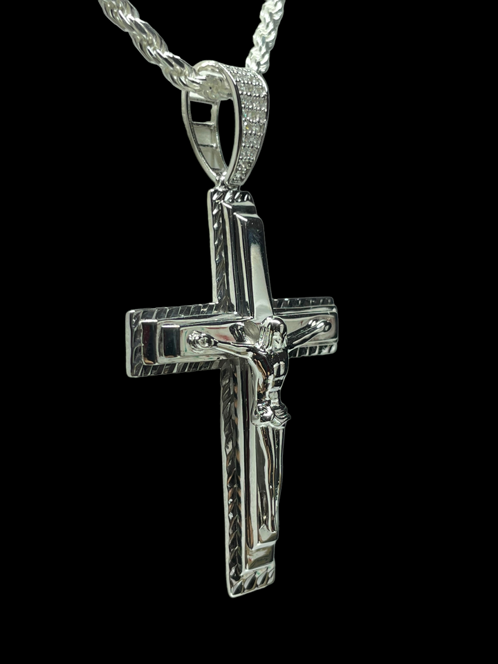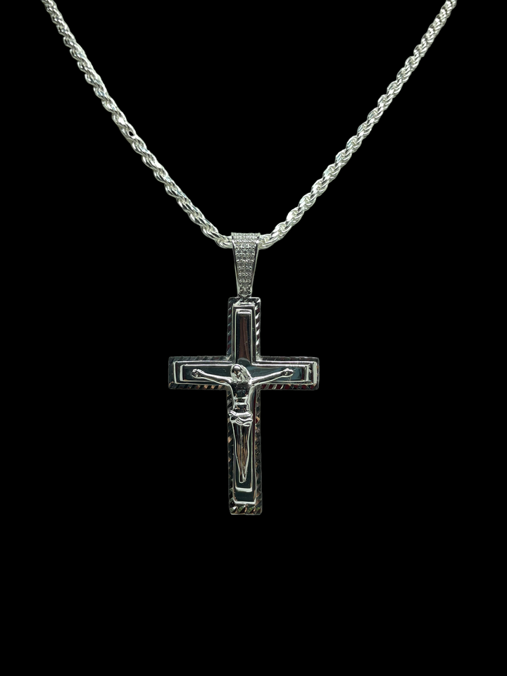 Cross Sterling Silver .925 2D Pendant Option to purchase only pendant or with rope style chain Pendant Measures 57 mm tall (2 1/4" tall) Necklace Measures 24" Cruz / Crucifijo Plata...