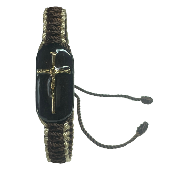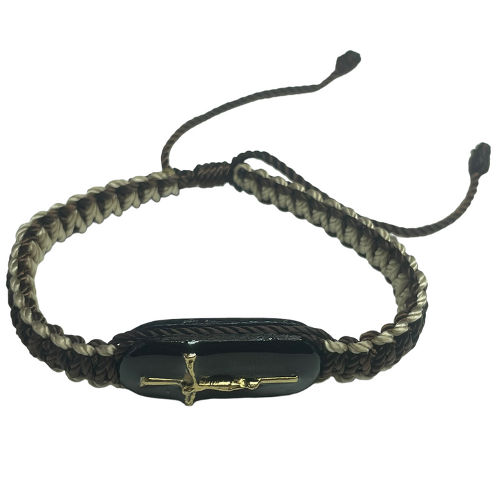 Cross Knotted Rope Bracelet Handmade Has a Gold Plated Cross/Crucifix image on top of a wood charm. Brown and Cream Color Knotted Rope Adjustable Made in Mexico Cruz Pulsera Hecho a Mano Tiene la...