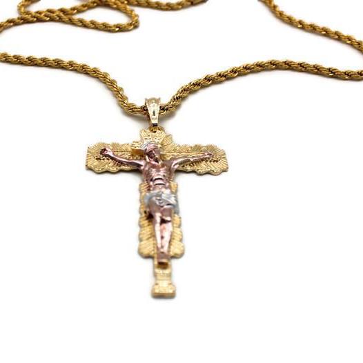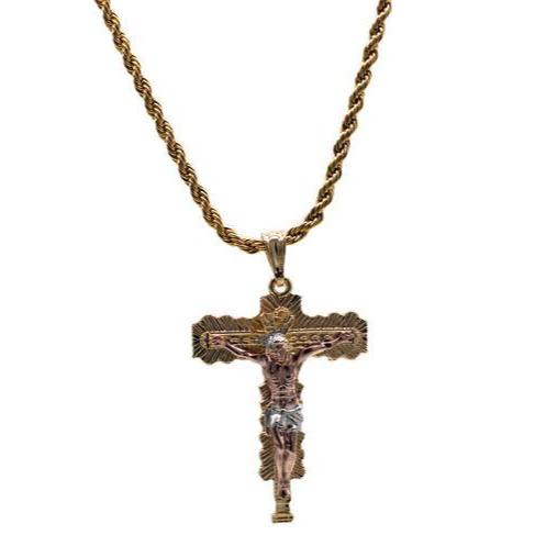 Crucifix with Necklace Crucifix/Cross is Three Tone Includes a 24" Rope Necklace that is Gold Filled over Stainless Steel 24K Gold Filled Pendant Measures 2 3/4” by 1 3/4" Necklace Measures...