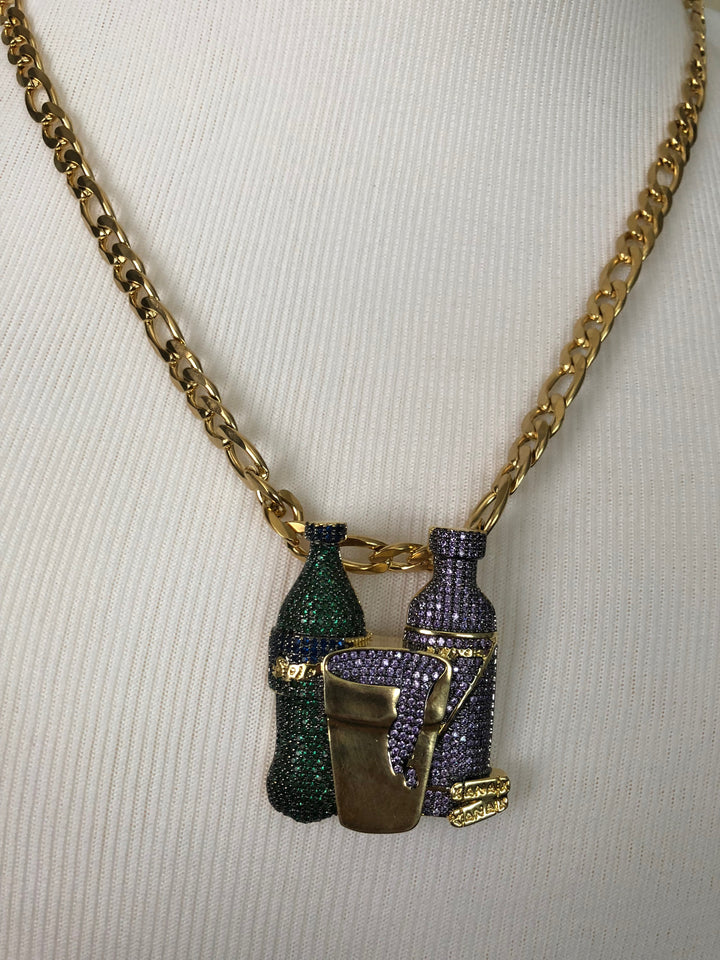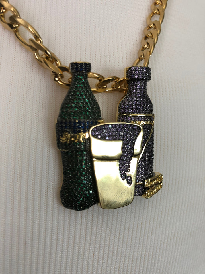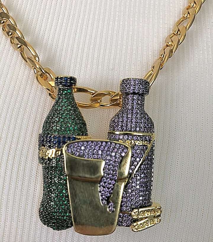 "Dirty Sprite" Iced Out Pendant with 28" Necklace Dirty Sprite Pendant is High Quality - Micro Pave Setting 14K Gold Finish over Brass Includes a 28" Necklace Pendant Measures 1 1/2"...