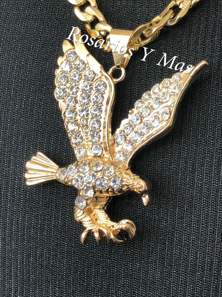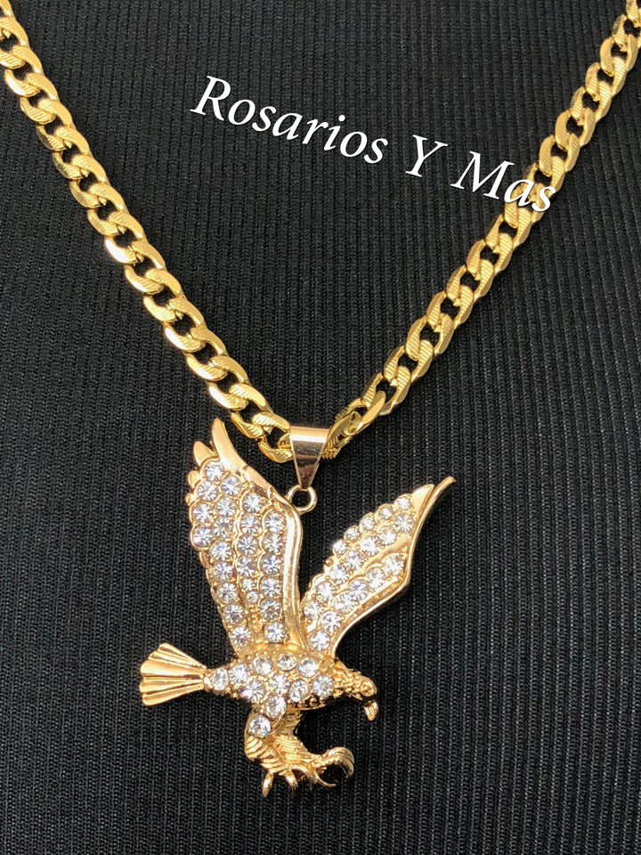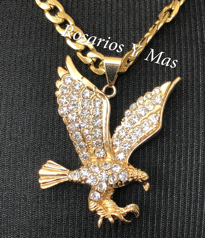 Medalla de Aguila con cadena de 24" Medalla de Aguila con Piedras Blancas Incluye cadena de 24" de Oro Laminado sobro Acero Es de 24K Oro Laminado Medalla Mide 2 1/2" Cadena Mide 24" ...