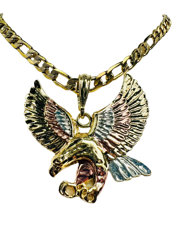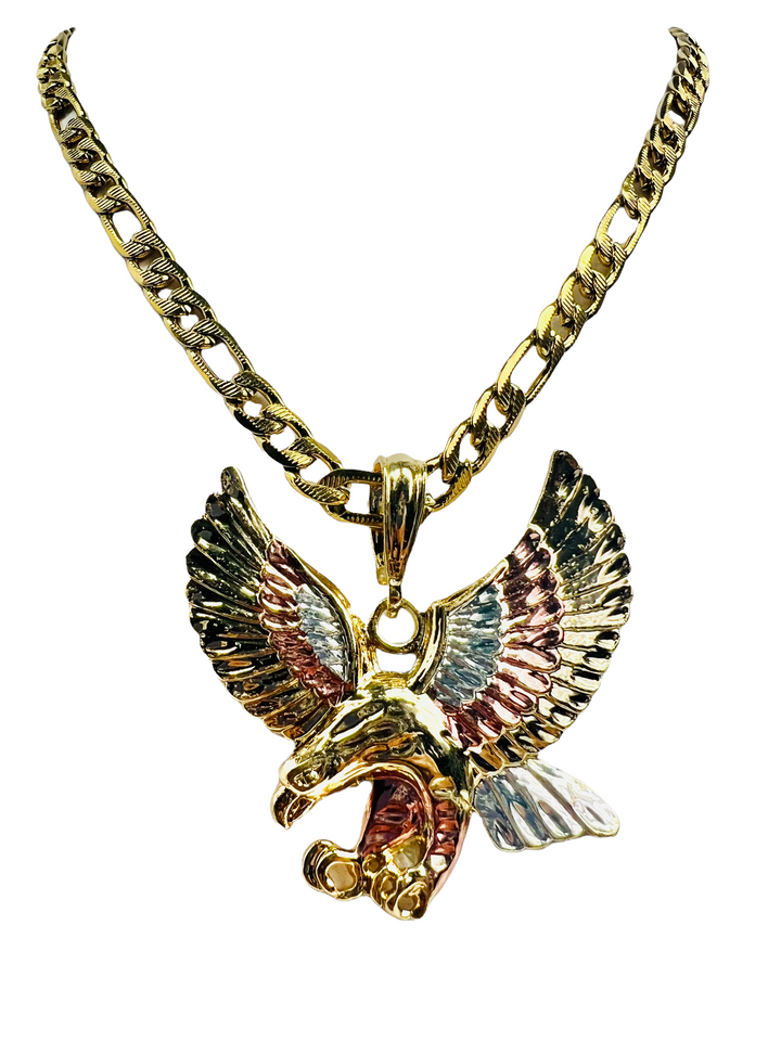 Eagle Large Three Tone Eagle Pendant Includes a 26" Figaro Gold Filled over Stainless Steel Necklace 24K Gold Filled Pendant Measures 50mm by 52mm Necklace Measures 26", 7mm Aguila Medalla Aguila...