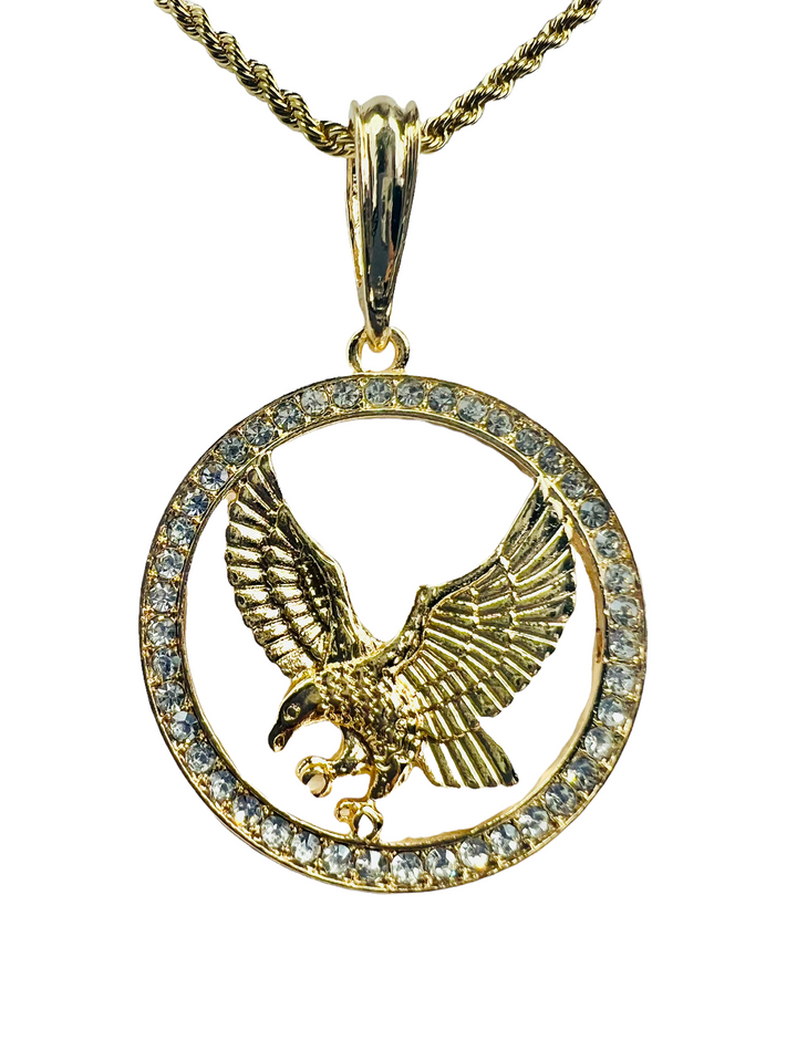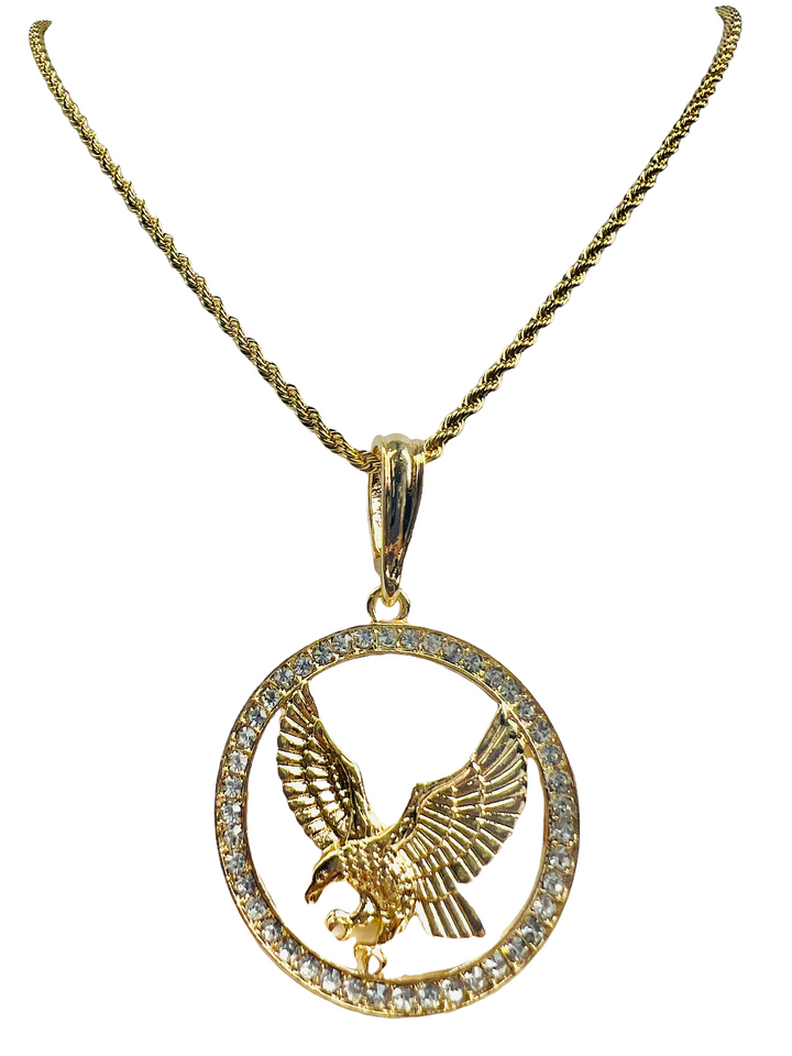 Eagle Round Eagle Pendant Pendant has CZ White Stones around the perimeter Includes a 24" Rope Gold Filled over Stainless Steel Necklace 24K Gold Filled Pendant Measures 41mm Necklace Measures 24", 3mm...