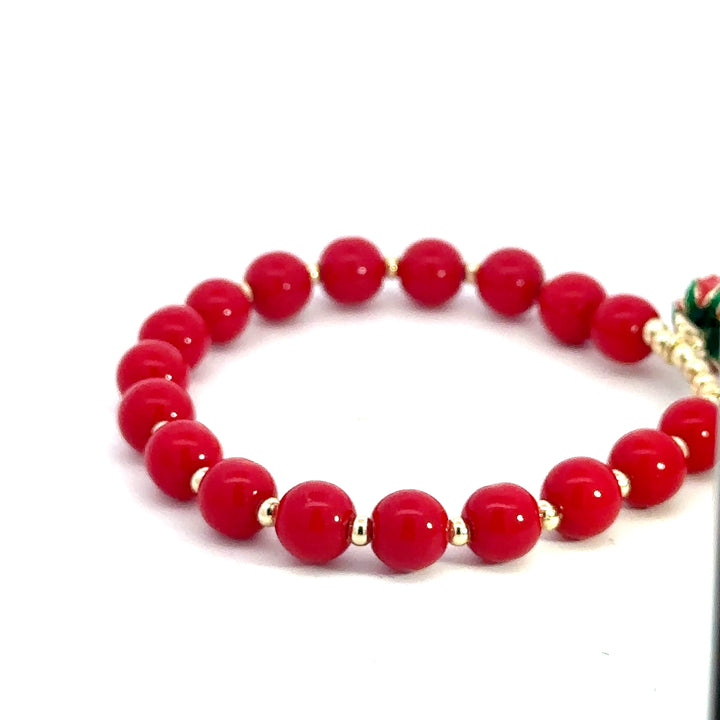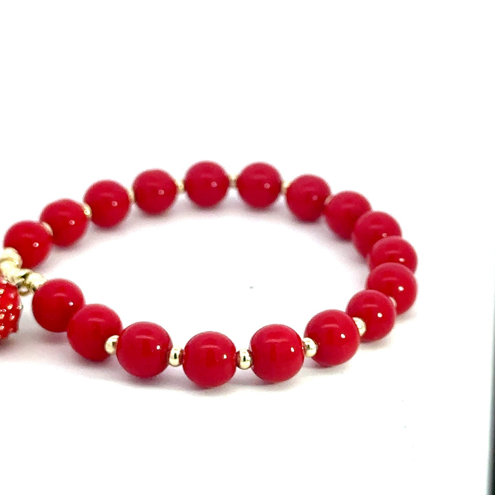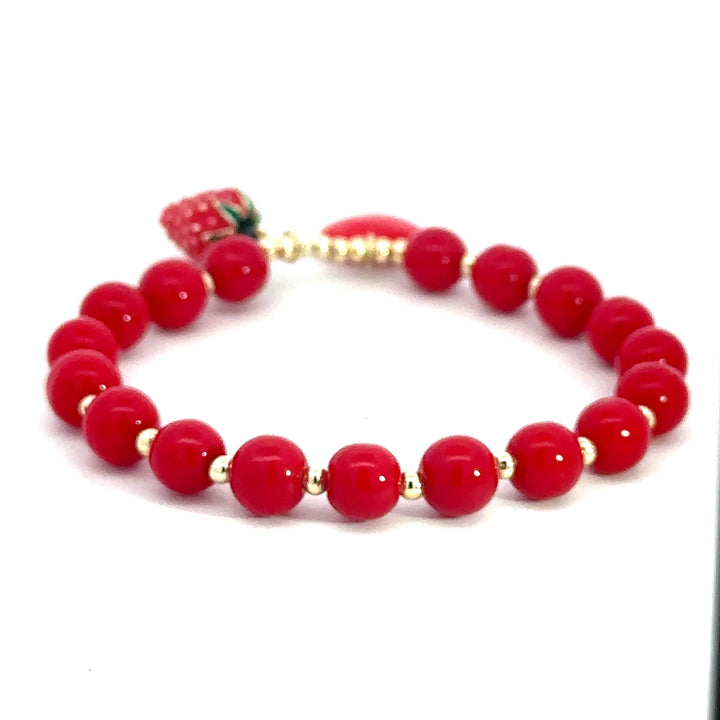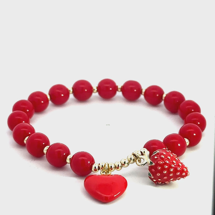 Heart and Strawberry Bracelet Red color Round Beads Gold Plated Beads Heart and Strawberry Charms Adjustable (Stretches)- One Size Fits All Pulsera de Fresa y Corazon Bolas Redondas color Rojas Bolas...