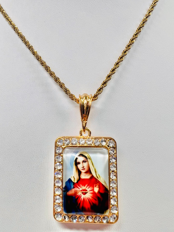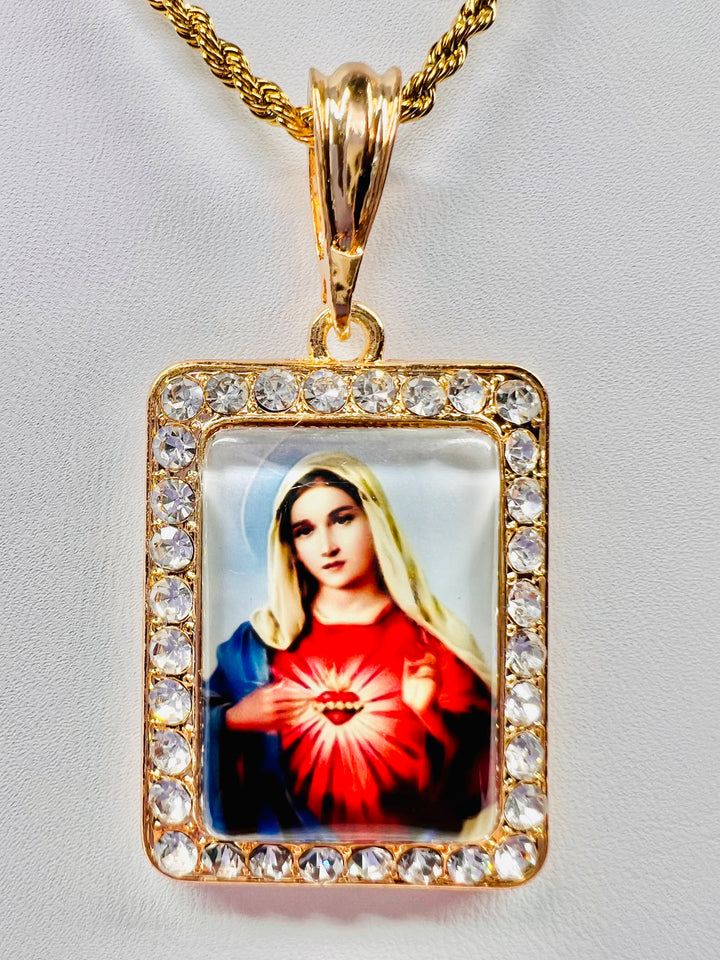 Immaculate Heart of Mary Immaculate Heart of Mary Color Pendant Pendant has white color CZ stones around the perimeter Includes a Rope 24K Gold Filled Stainless Steel Necklace 24K Gold Filled Pendant Measures...
