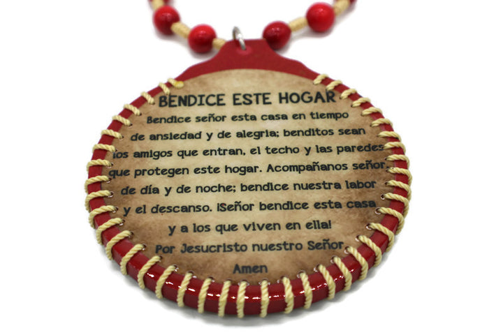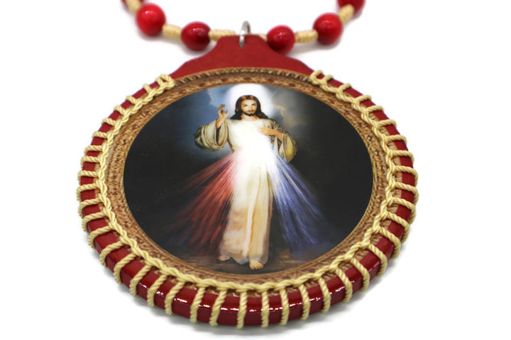 Jesus Christ Scapular Handmade Large Round Wood Pendant Red Color Made with Nylon Knotted Rope Has 10mm Round Wood Beads Adjustable Pendant has color image of Jesus Christ in Front Side and a...