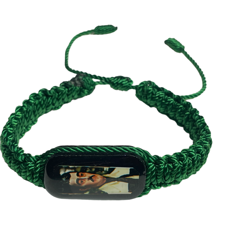 Jesus Malverde Knotted Rope Bracelet Black color wood charm with Jesus Malverde image Hand made in Mexico Adjustable one size fits all Green color knotted rope Jesus Malverde Pulsera Medalla de...