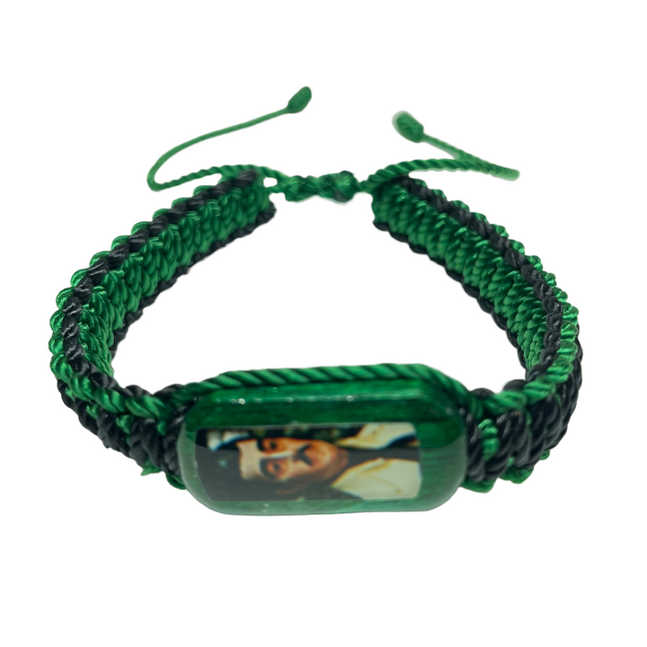 Jesus Malverde Reversible Knotted Rope Bracelet Wood charm with Jesus Malverde image on both sides Hand made in Mexico Adjustable one size fits all Green and Black color knotted rope Jesus...