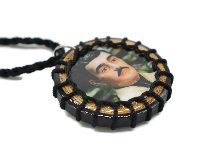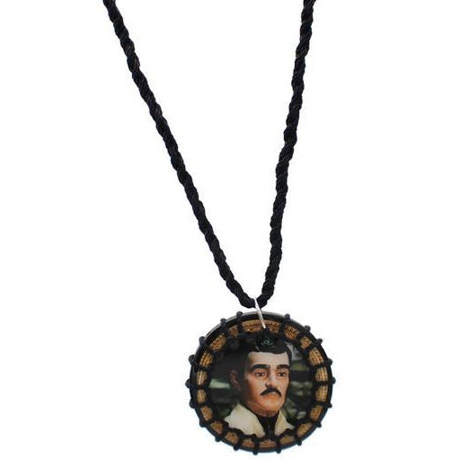 Jesus Malverde Scapular Handmade Round Wood Pendant Black Color Made with Nylon Knotted Rope Adjustable Pendant has color image of Jesus Malverde on both sides Pendant measures 2" Escapulario de Jesus Malverde Hecho...