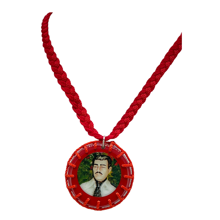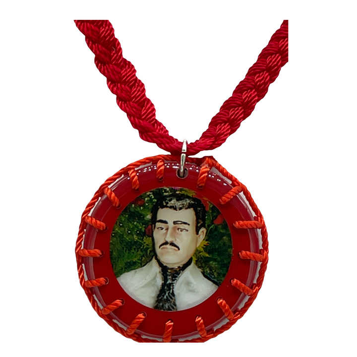 Jesus Malverde Scapular Handmade Wood Pendant Red Color Made with Nylon Knotted Rope Adjustable Pendant has color image of Jesus Malverde on both sides Pendant measures 1 3/4" Escapulario de Jesus Malverde Hecho a Mano...