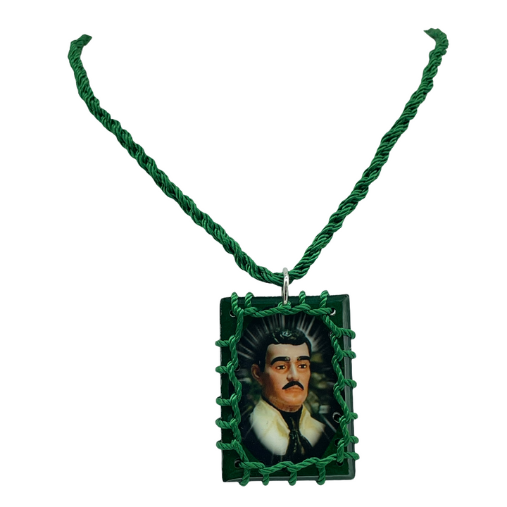 Jesus Malverde Scapular Handmade Wood Pendant Green Color Made with Nylon Knotted Rope Adjustable Pendant has color image of Jesus Malverde on both sides Pendant measures 1 1/2" by 2" Escapulario de Jesus Malverde Hecho...