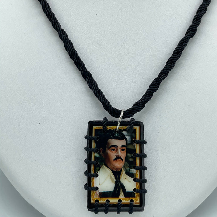 Jesus Malverde Scapular Handmade Wood Pendant Black Color Made with Nylon Knotted Rope Adjustable Pendant has color image of Jesus Malverde on both sides Pendant measures 1 1/8" by 1 3/4" Escapulario de Jesus...
