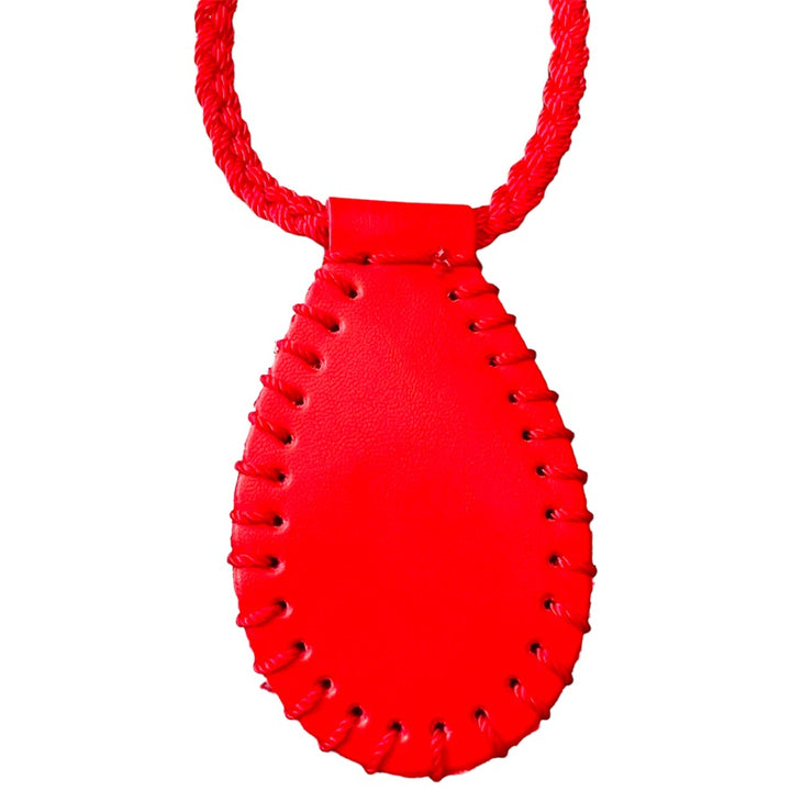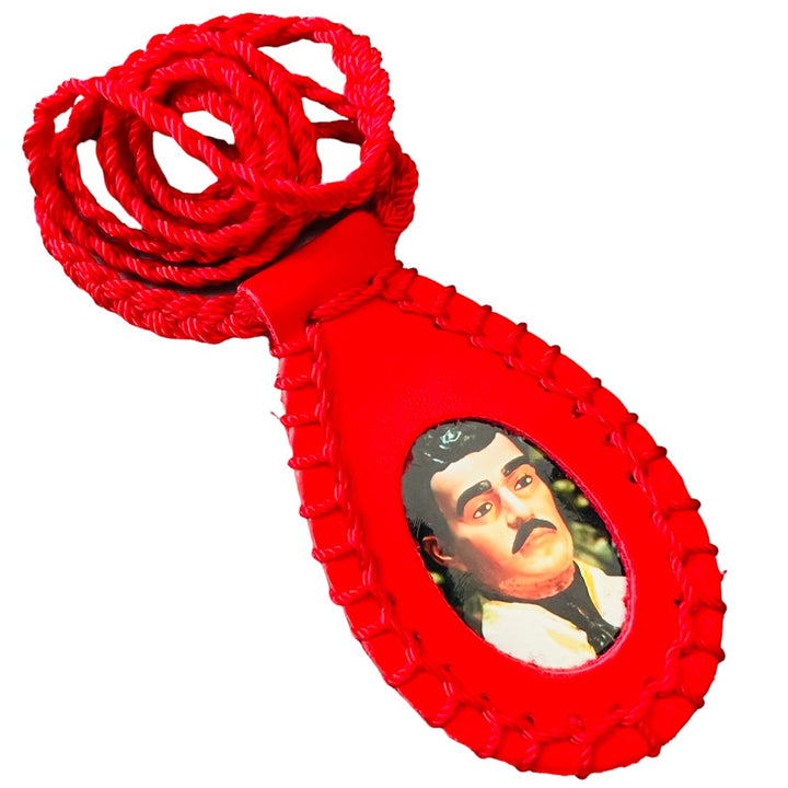 Jesus Malverde Scapular Handmade Leather Pendant Red Leather Color Made with Red Knotted Rope Pendant has color image of Jesus Malverde Necklace measures 26" Pendant measures 3" Escapulario de Jesus Malverde ...