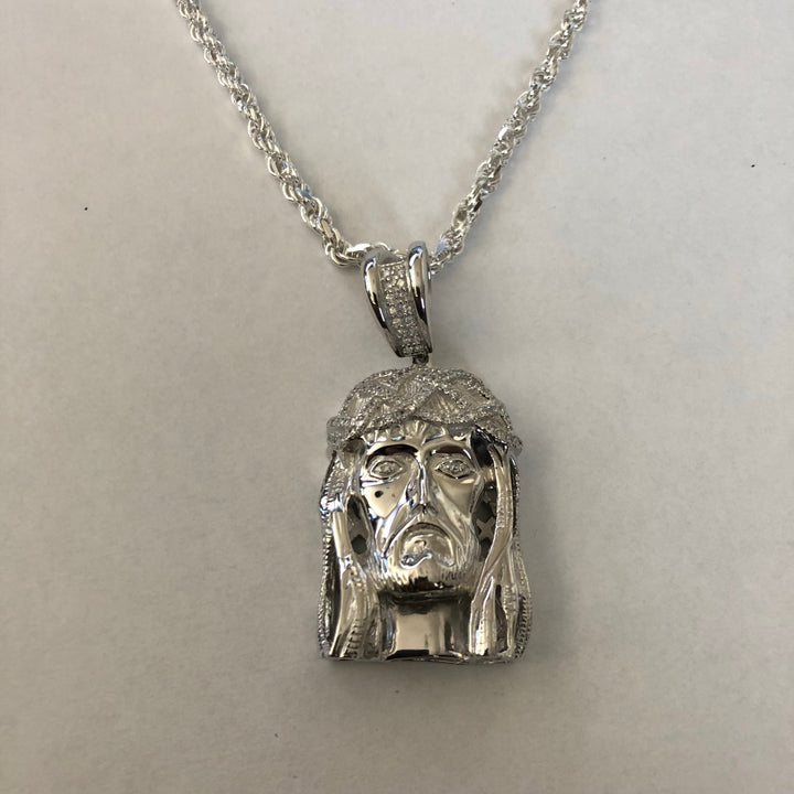 Cara de Jesús La Medalla es de 100% .925 Plata Tiene piedras Blancas Cadena Torsal de mide 26” is de .925 Plata Medalla mide 2 1/2” Cadena mide 26” Plata de...
