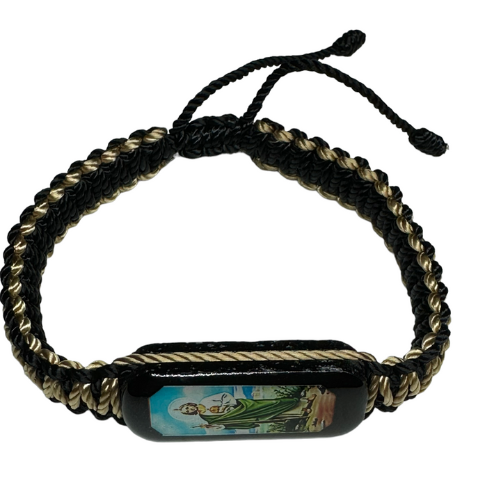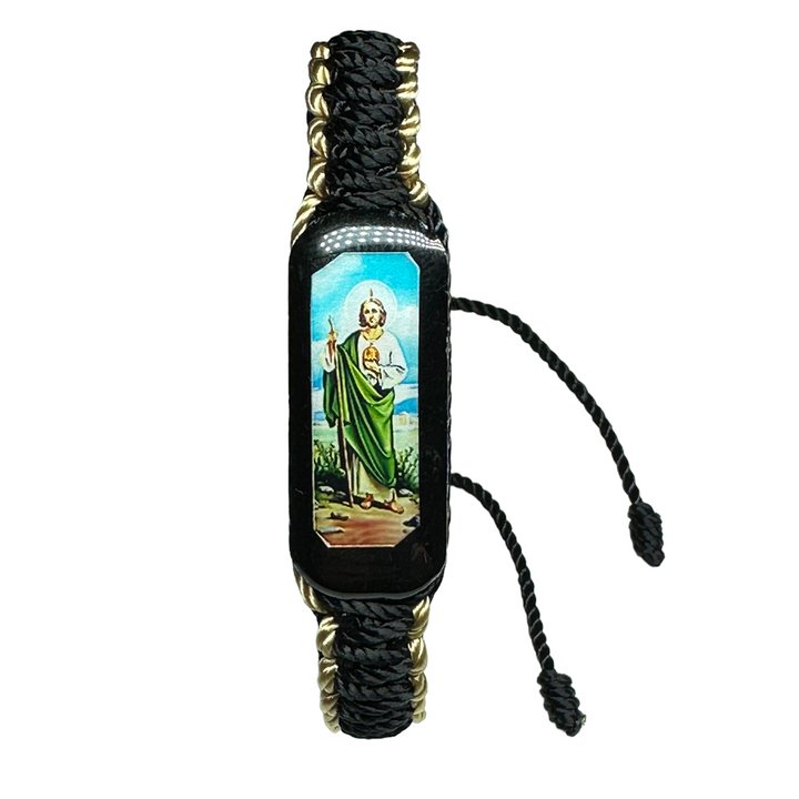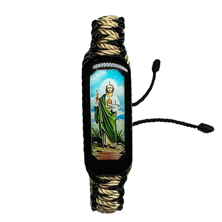 St Jude Knotted Rope Bracelet Large wood charm with St Jude image Reversible (Image on Both Sides) Hand made in Mexico Adjustable one size fits all Black and Tan color knotted rope San...