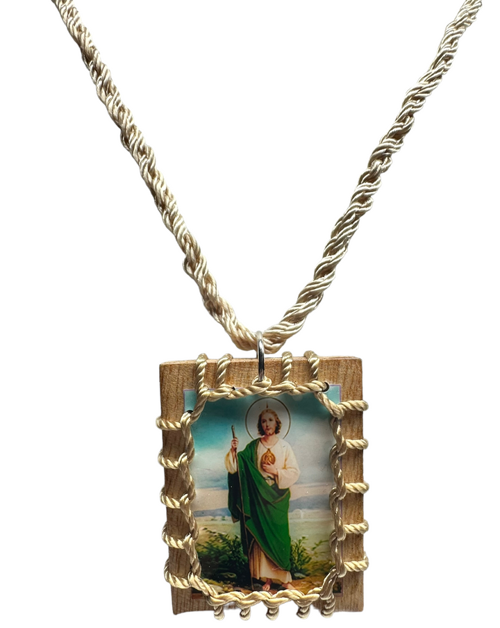 Large St Jude Reversible Scapular Exclusive to Rosarios Y Mas Reversible Wood pendant with St Jude image on both sides Handmade in Mexico Natural/Cream Color Knotted Rope Pendant measures 1 1/2" by...