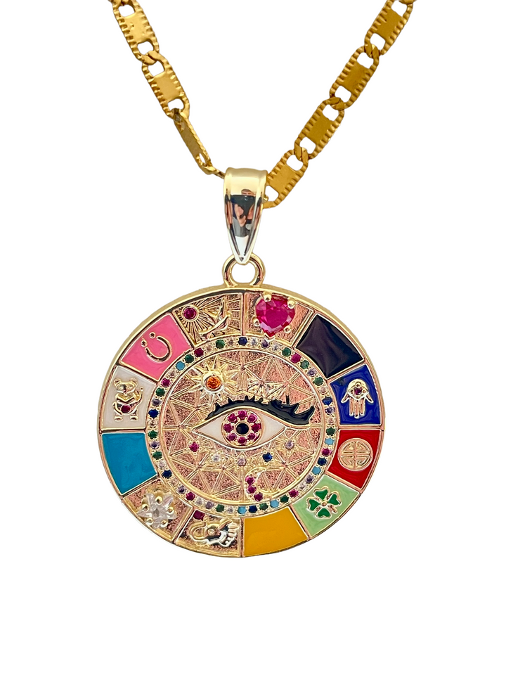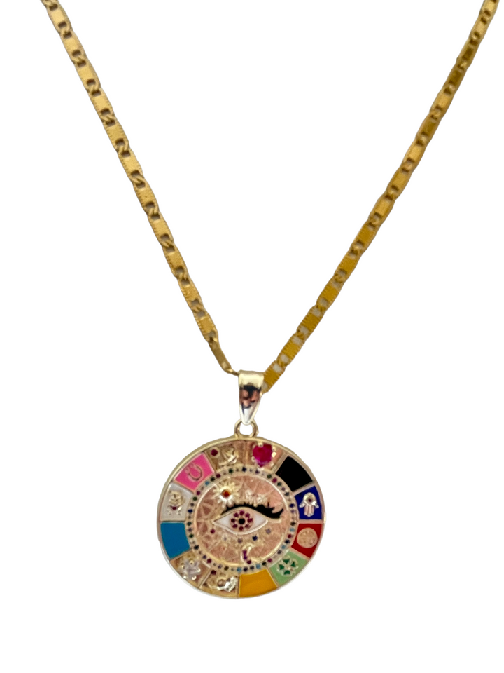 Lucky Necklace Round Pendant with Multiple Lucky images Some of the images are evil eye, hamsa hand, horseshoe, etc. Pendant is 24K Gold Filled Necklace is 24K Gold Filled over Stainless Steel Pendant...