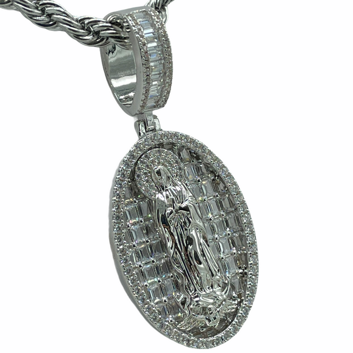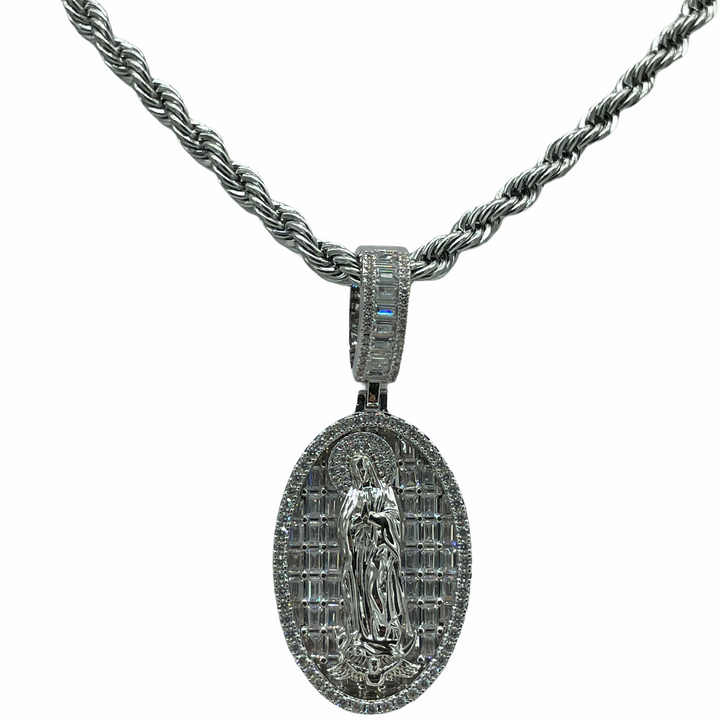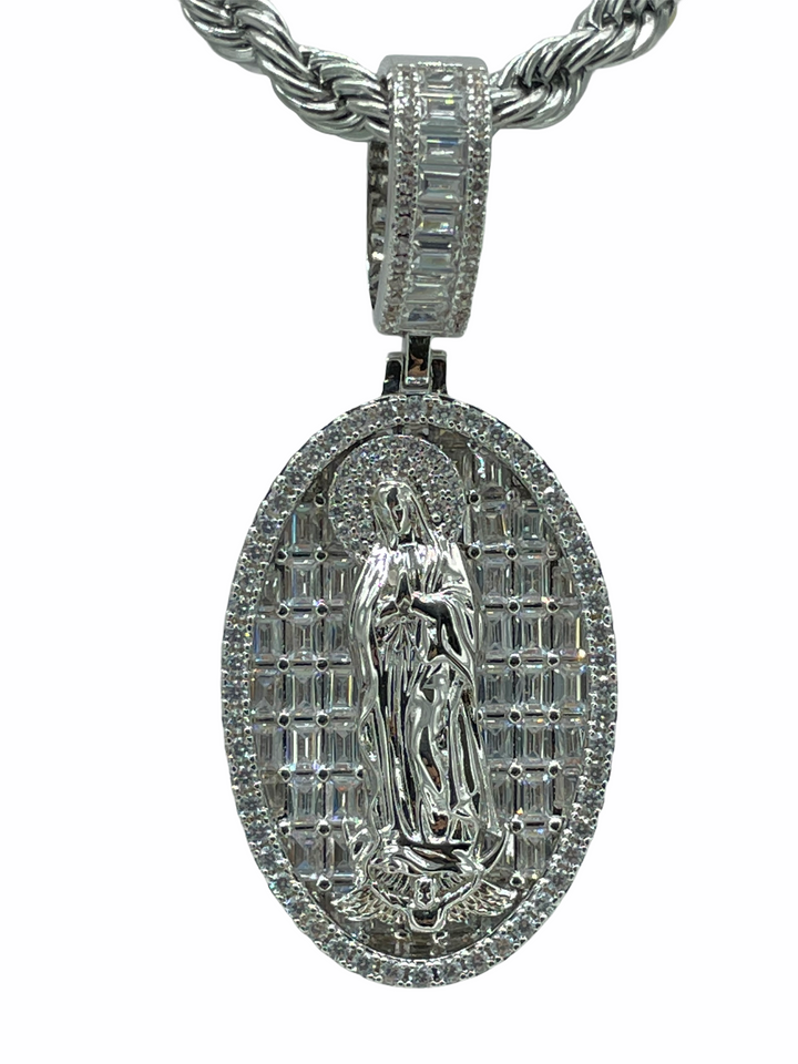Our Lady of Guadalupe Our Lady of Guadalupe Pendant Micro Pave Stones Includes Necklace 14K White Gold Finish Pendant Measures - 2 1/4" Necklace Measures - 26" Virgen de Guadalupe Medalla...
