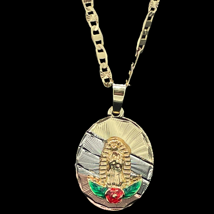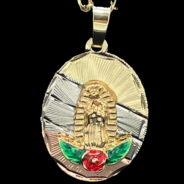 Our Lady of Guadalupe Our Lady of Guadalupe Pendant - Three Tone Includes Necklace 24K Gold Filled Pendant Measures - 1 1/2" Necklace Measures - 22" Virgen de Guadalupe Medalla de...