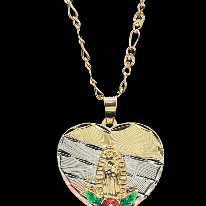 Our Lady of Guadalupe Heart Our Lady of Guadalupe Heart Pendant - Three Tone Includes Necklace 24K Gold Filled Pendant Measures - 1 1/2" Necklace Measures - 22" Virgen de Guadalupe...