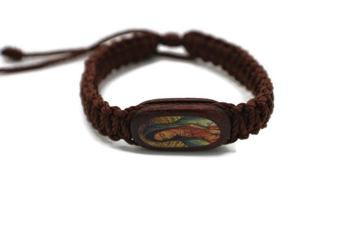 Our Lady of Guadalupe Bracelet Handmade Wood Charm Brown Color Made with Nylon Knotted Rope Adjustable Pendant has color image of Our Lady of Guadalupe on both sides Virgen de Guadalupe...