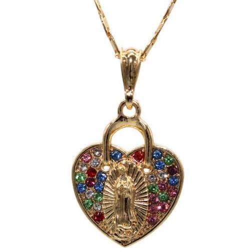 Our Lady of Guadalupe Heart with Necklace Our Lady of Guadalupe Pendant - Numerous Color Stones Includes a 24" Necklace that is Gold Filled 24K Gold Filled Pendant Measures 1 3/4" Necklace Measures...