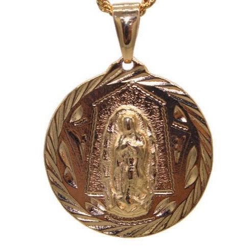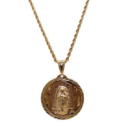 Our Lady of Guadalupe with Necklace Our Lady of Guadalupe Round Pendant Includes a 24K Gold Filled Necklace Pendant Measures 1 3/4" Necklace Measures 22"- 2mm Virgen de Guadalupe con Cadena Medalla de Virgen...