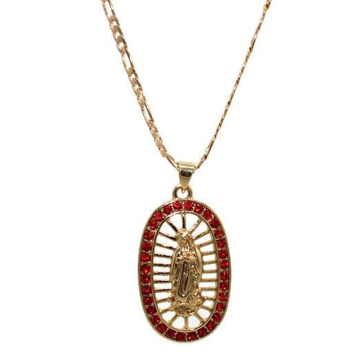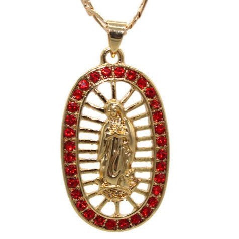 Our Lady of Guadalupe with Necklace Our Lady of Guadalupe Pendant - Has Red Stones Includes a 24" Necklace that is Gold Filled 24K Gold Filled Pendant Measures 1 3/4" Necklace Measures 24"- 3mm...
