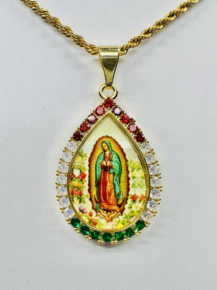 - Our Lady of Guadalupe Tear Drop Pendant - Has Mexican color stones (Red, White and Green)