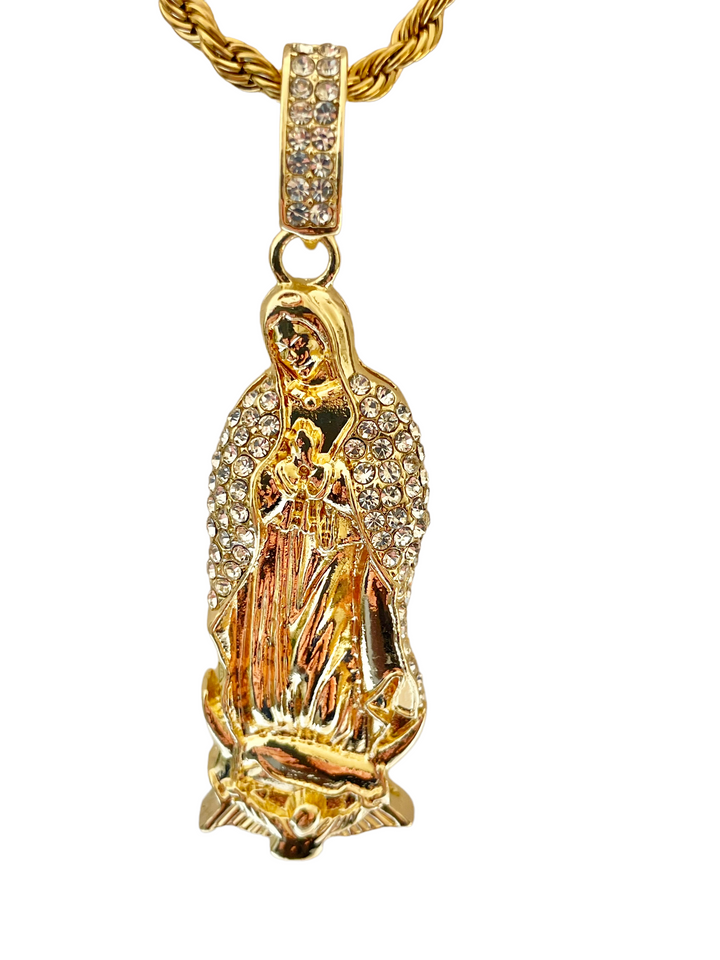 - Our Lady of Guadalupe Pendant has White CZ Stones.