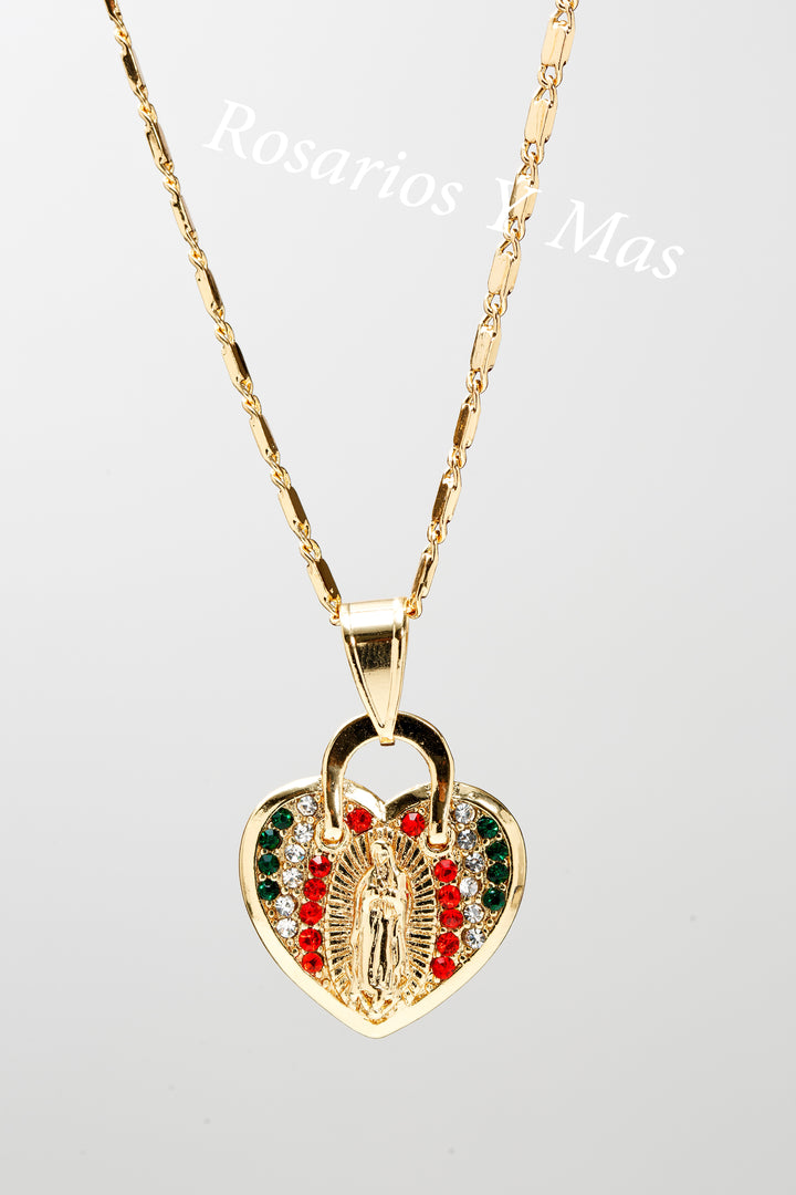 Medalla de La Virgen De Guadalupe in a Heart con cadena de 24" Medalla con la imagen de La Virgen De Guadalupe con piedras color Blanco, Verde y Rojo Incluye cadena...